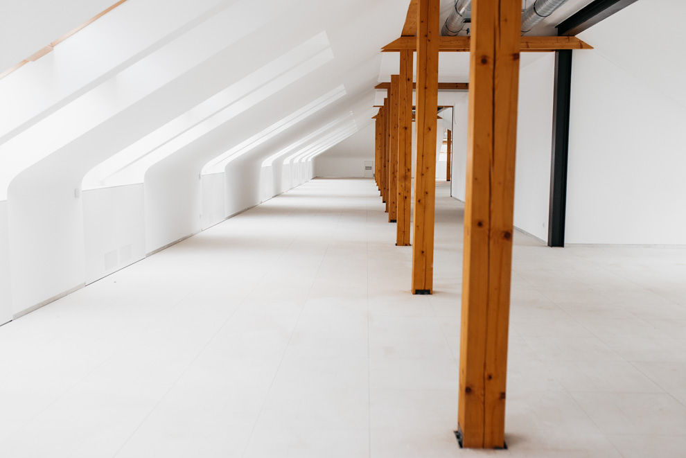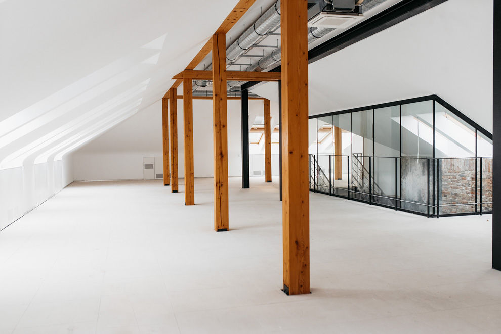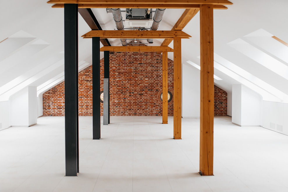 An office space located on the first floor of the Y building combining restored historical construction with modern elements.